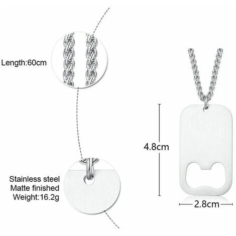1. catena in acciaio inossidabile2. Cartellino in metallo3. Apribottiglie4. FACILE DA USARE / REGOLARE / TRASPORTARE – L’apricatene è abbastanza piccolo e leggero da stare in mano, in tasca, in macchina o persino in un cassetto della cucina. Con una leggera pressione, il tappo può essere facilmente rimossodella bottiglia.