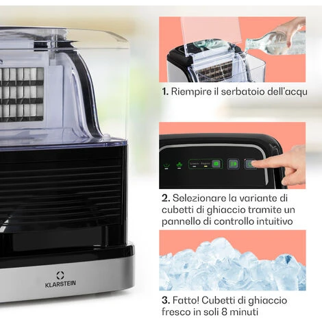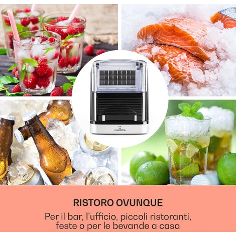 Anche l’utilizzo è molto semplice, con pochi tasti e in un batter d’occhio è possibile impostare il dispositivo. Prestazioni eccellenti non vuol dire dispositivo enorme! La macchina per il ghiaccio Kristall di Klarstein è molto piccola e stretta ed si adatta perfettamente anche ai banconi piccoli e alle cantine per feste.
